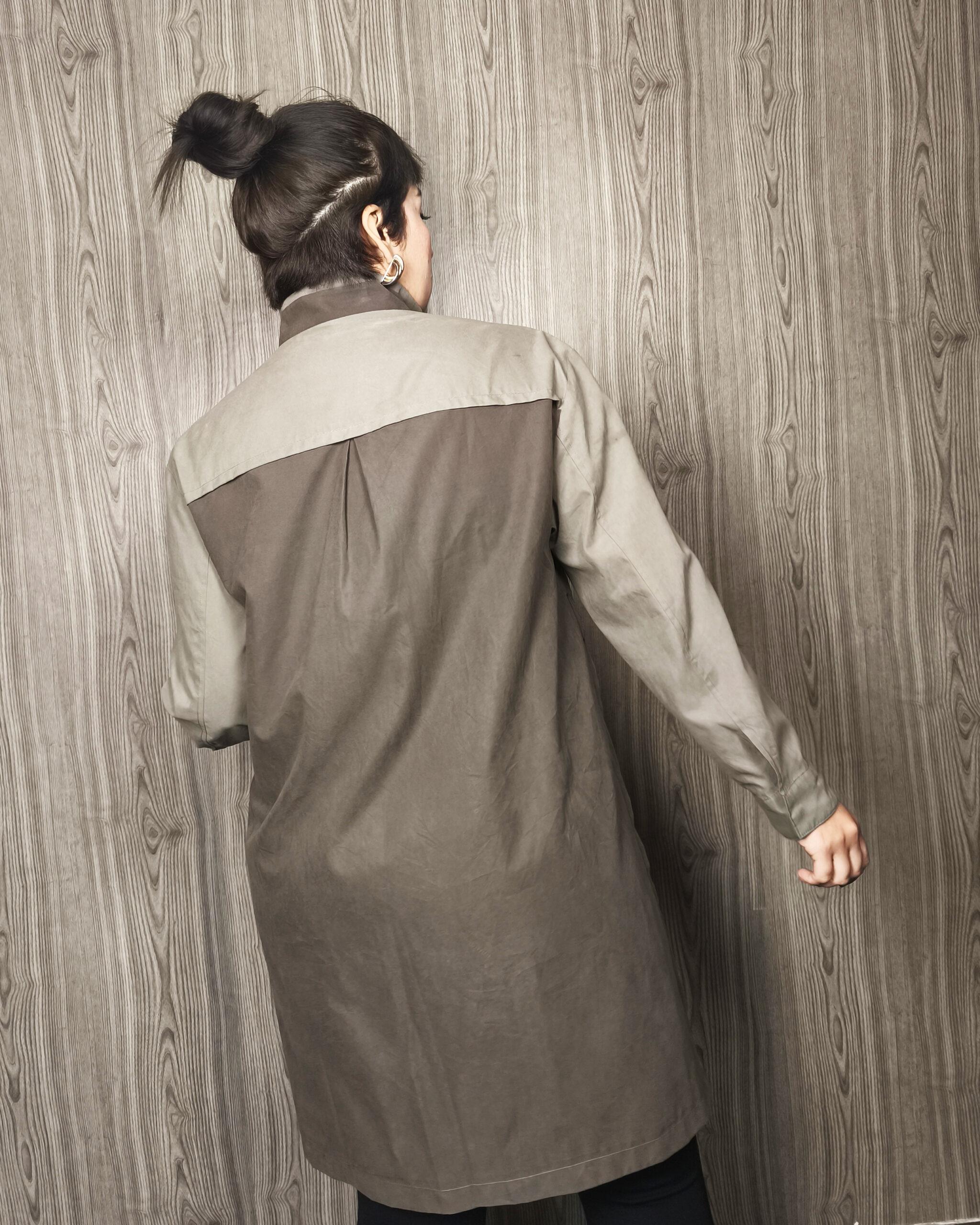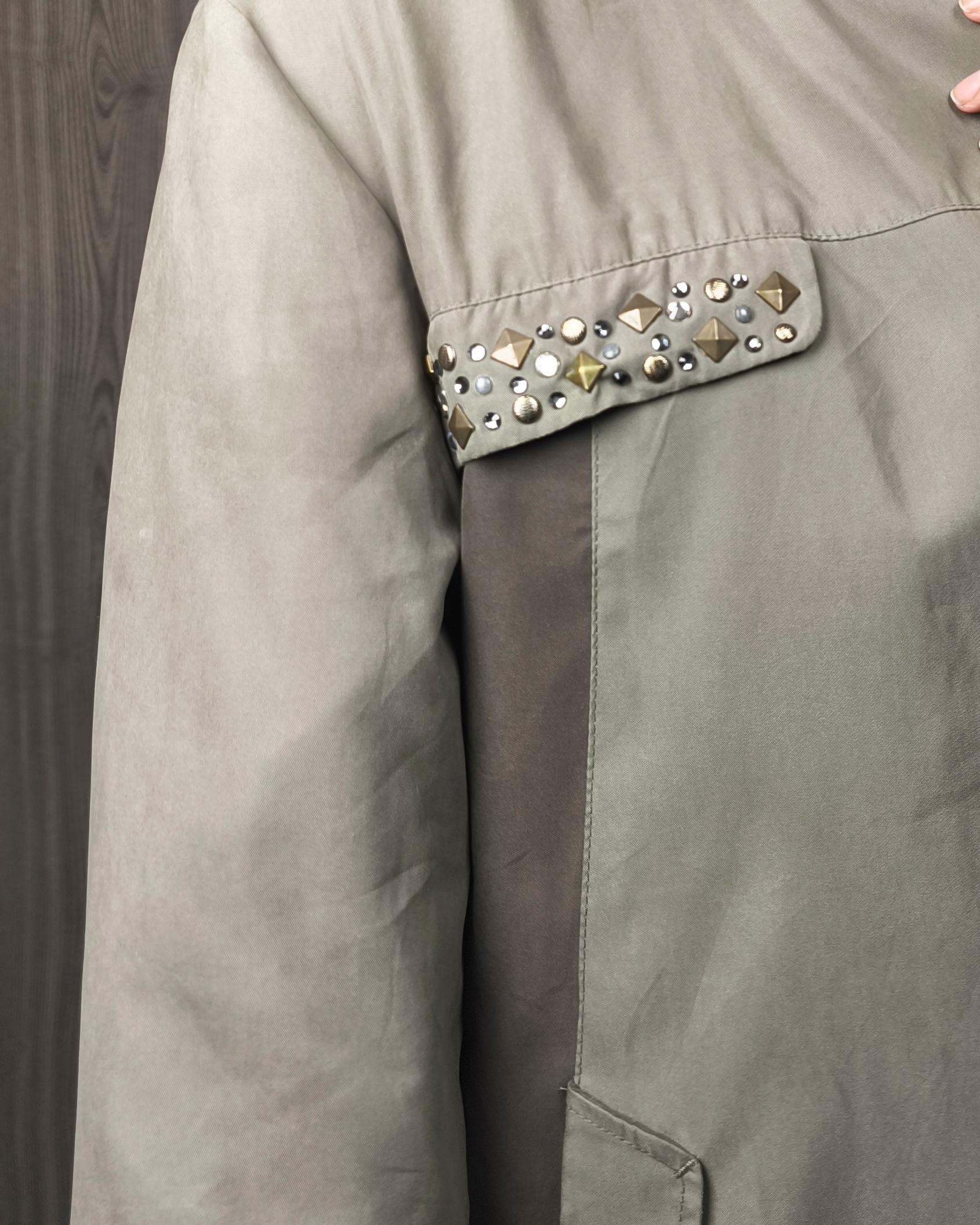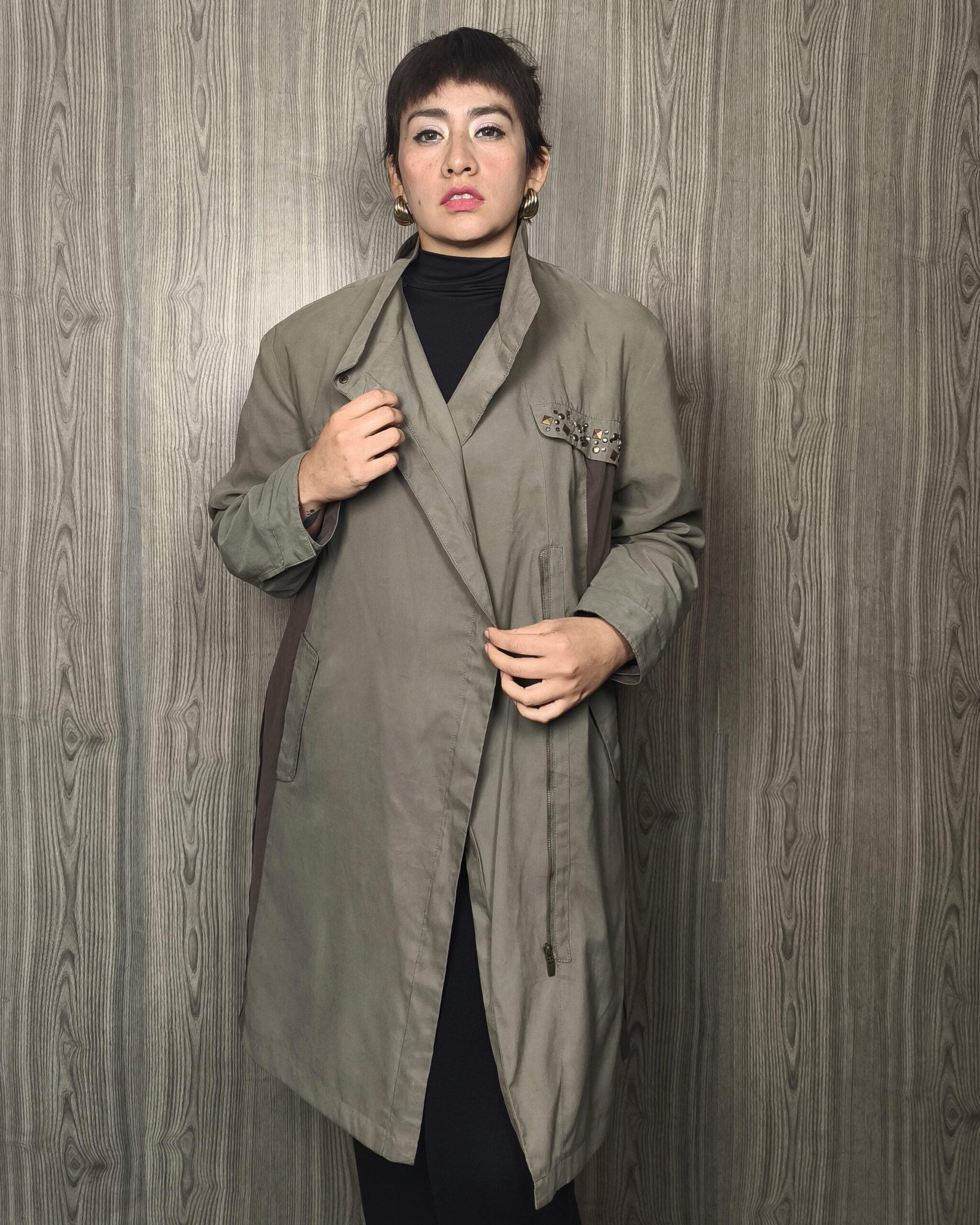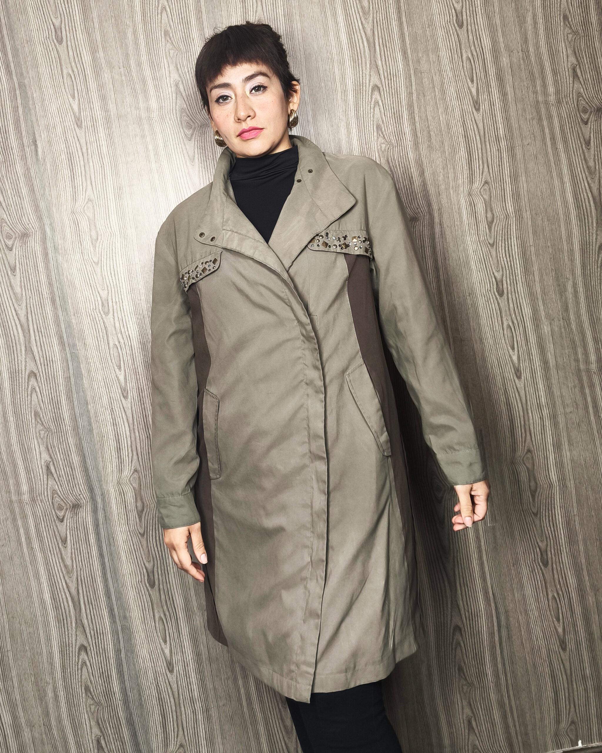 Casaca tipo agamuzada, en corte A, con doble tono en verde olivo y verde militar, con detalle de tachas, greviches muy sofisticados. Talla S/M – Prenda única.