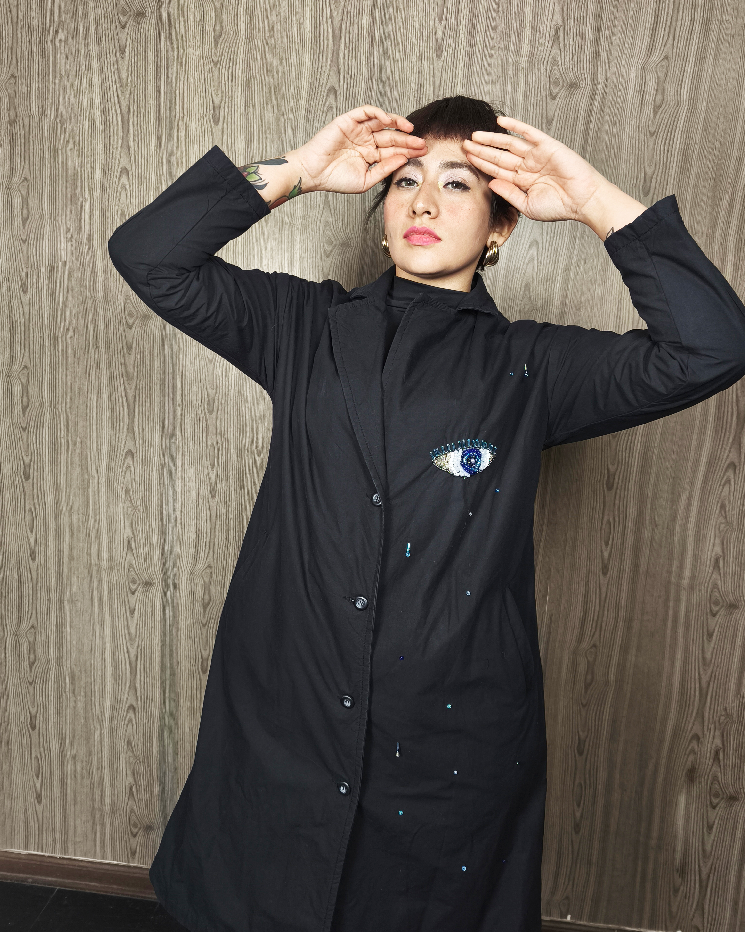 Una prenda llena de personalidad y simbolismo. Este saco negro largo se convierte en protagonista gracias a su bordado artesanal en forma de ojo, elaborado con pedrería en tonos azules y plateados. Una pieza única que mezcla arte, moda y estilo contemporáneo, perfecta para destacar en cualquier ocasión.